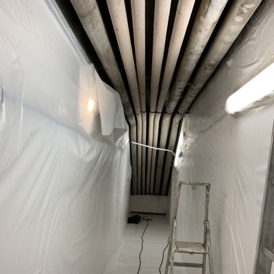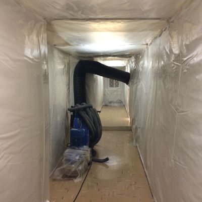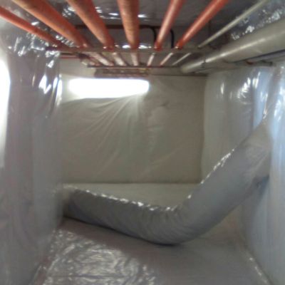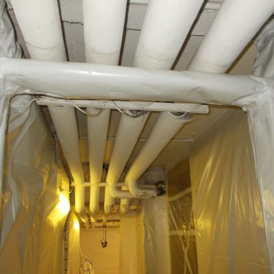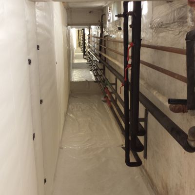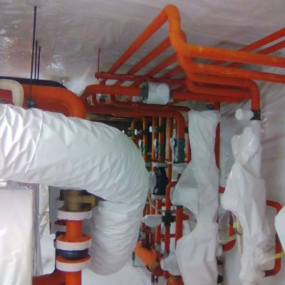 Bonifiche in ambiente confinato dinamico di isolamenti presenti su tubazioni termotecniche, cisterne, intercapedini, guarnizioni, caldaie, pavimentazioni in vinil-amianto con relativo collante contaminato e altri manufatti con presenza di amianto friabile.